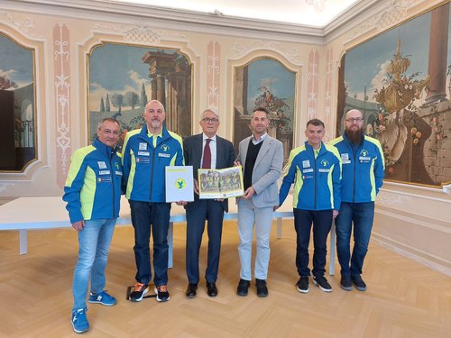 Il Presidente Daniele Decorte con alcuni esponenti dell'Associazione ricevuto in Fondazione dal Presidente Bruno Malattia insieme ad Andrea Cainero, impegnato nell'organizzazione degli eventi, a riconoscimento di un'attività che offre supporto a eventi sportivi, istituzionali e sociali, incarnando valori come solidarietà, responsabilità e inclusione.