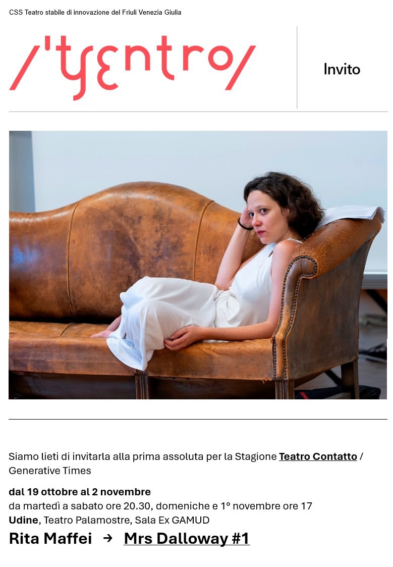 Venerdì 24 ottobre ore 18 la compagnia incontra il pubblico in dialogo con la professoressa Marisa Sestito traduttrice del romanzo “Mrs Dalloway” di Virginia Woolf edito da Marsilio [ingresso libero]