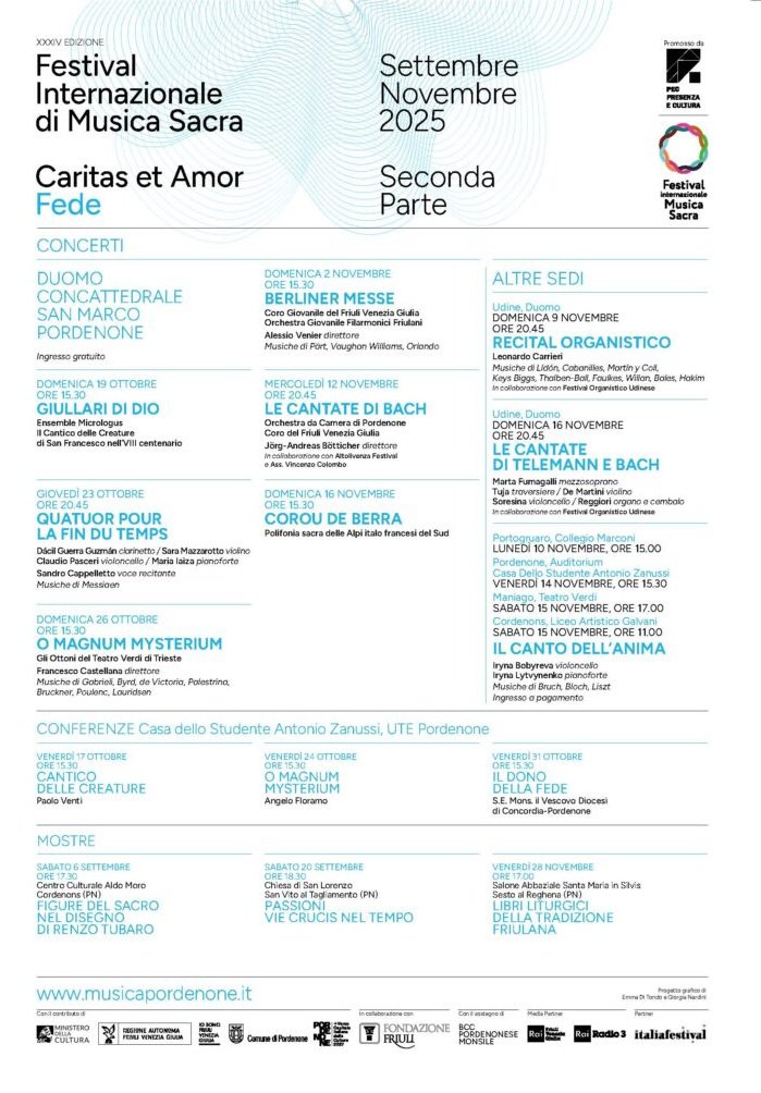 34ª EDIZIONE DEL FESTIVAL INTERNAZIONALE DI MUSICA SACRA IN PROGRAMMA DAL 17 OTTOBRE AL 16 NOVEMBRE 2025: 8 CONCERTI INTERNAZIONALI A PORDENONE E UDINE, 4 LEZIONI-CONCERTO E 3 EVENTI-CONFERENZA SUL FILO ROSSO DELLA FEDE, VIRTÙ TEOLOGALE