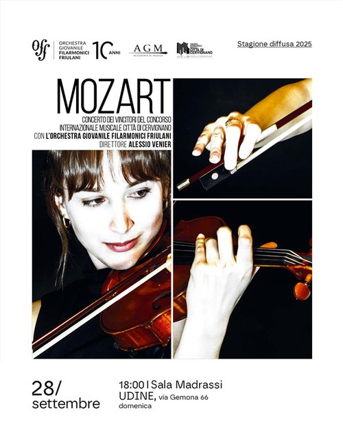 Il concerto, interamente dedicato a Mozart, con l’Orchestra Giovanile Filarmonici Friulani, diretta da Alessio Venier, accompagnerà i vincitori delle categorie pianoforte e violino del Concorso Internazionale Musicale Città di Cervignano: giovani musicisti under 30 provenienti da diversi paesi, selezionati da una giuria internazionale.