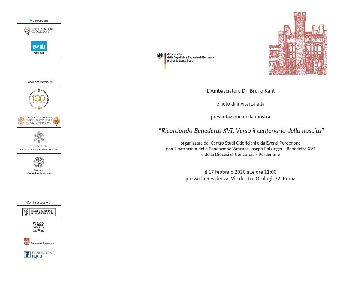 Centro Studi Odoriciani - Eventi Pordenone - Fondazione Vaticana Joseph Ratzinger - Benedetto XVI - Diocesi di Concordia - Pordenone - Regione autonoma Friuli Venezia Giulia - Io sono Friuli Venezia Giulia - Comune di Pordenone - Fondazione Friuli - Ambasciata della Repubblica Federale di Germania presso la Santa Sede