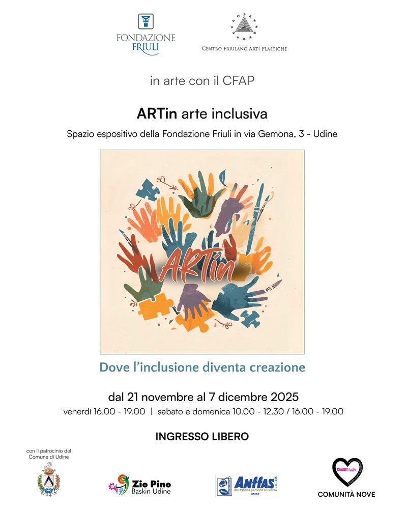Ispirandosi al Baskin, sport in cui persone con e senza disabilità giocano insieme valorizzando le capacità di ciascuno, ARTin applica lo stesso approccio al fare arte. L’obiettivo è realizzare una “opera d’arte” mettendo in campo e sfruttando le vare capacità e abilità disponibili. Sfida accettata dai partner. Come nel baskin, in cui ogni squadra è composta sia da giocatori disabili che non disabili, ciascuno dei quali è portato ad esprimersi al massimo delle sue capacità insieme ai compagni, sono stati formati quattro gruppi di lavoro, quattro “squadre”, in questo caso non in competizione tra di loro. Promosso da Zio Pino Baskin, il progetto coinvolge gruppi misti composti da “artisti” del CFAP Centro Friulano Arti Plastiche, di Anffas Udine, di Comunità Nove, insieme a operatori e volontari. Tutti, intervenendo ognuno secondo le proprie “capacità artistiche”, hanno contribuito a produrre le opere finali. Nel complesso hanno lavorato oltre trenta persone dalle competenze più varie e sono stati utilizzati diversi materiali, anche di riciclo, e vari strumenti di lavoro. Il tema affrontato è il rapporto tra la natura in tutte le sue forme e l’essere umano. Sono due le tipologie di opere prodotte ed esposte. La prima è una installazione in cui si integrano i lavori di ognuno degli “artisti”, una trentina di opere che dialogano tra loro ma in cui ogni autore è riconoscibile anche per come ha affrontato il tema dato. Le altre sono quattro opere, una per ogni gruppo, realizzate collettivamente, in cui si fondono le varie mani rendendo irriconoscibile l’apporto di ciascuno ma mettendo in risalto il lavoro di squadra. Piante, animali, pietre ed esseri umani rappresentati, anche in maniera astratta, nell’interazione tra di loro, fanno capire il pensiero degli autori sul rapporto che il genere umano deve avere con la natura che lo ospita, con uno sguardo attento anche alle preoccupazioni del presente. Il risultato dell’esperienza di ARTin mostra che la creatività condivisa genera valore, relazione e bellezza e l’esito della sfida non può che invitare a proseguire il percorso con nuove edizioni.