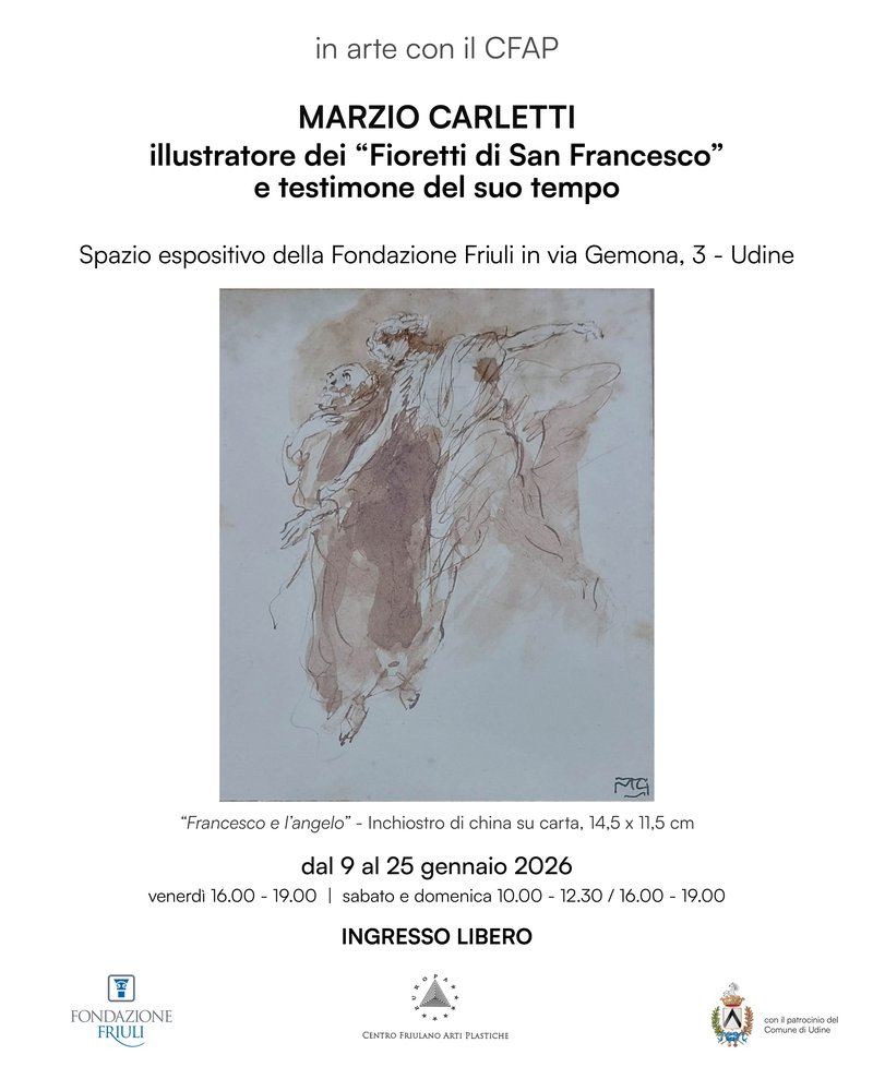 MARZIO CARLETTI (Udine, 1874 - 1957). Oggi, grazie ai numerosi lavori lasciati ai posteri, non è difficile definire il percorso artistico di Marzio Carletti, dai primi tentativi giovanili tesi a superare la mancanza di una formazione accademica al perseguimento di una formazione da autodidatta. In gioventù, dopo aver conseguito la licenza professionale, si recò per lavoro in Austria e, conoscendo bene la lingua, ebbe l’opportunità di studiare testi di storia dell’arte in lingua tedesca. Al rientro in Friuli aveva già maturato le prime esperienze di disegno e di pittura e si recava spesso a Venezia per visitare le principali chiese e gallerie d’arte e per incontrare diversi artisti suoi contemporanei. Appare più difficile tracciare la personalità dell’uomo, schivo e riservato, dotato di spiccata sensibilità per la rappresentazione realistica, ma anche incline ad indagare gli atteggiamenti umani. Non promuoveva il suo lavoro e non ebbe l’iniziativa di far conoscere le sue opere ai contemporanei e nemmeno quasi ai familiari. Solo nel 1950, dopo una visita di Chino Ermacora al suo studio artistico, gli amici lo motivarono ad esporre i suoi lavori in una mostra collettiva per l’inaugurazione della scuola a Cordovado, luogo nieviano, insieme con Bepi Liusso, Ermanno Malisan, Luigi Diamante, Virgilio Tramontin e altri. Nell’anno successivo espose una scelta di opere al Circolo Artistico Friulano a palazzo D’Aronco, a Udine e, rincuorato dal successo della “personale”, fu lo stesso Marzio a proporsi per la seconda mostra nazionale d’arte francescana a Caslino d’Erba (Como), dove dieci delle sue opere vennero selezionate ed esposte. I luoghi dell’attività artistica di Marzio furono principalmente quelli dove si sviluppava la vita quotidiana, dove ritraeva i numerosi familiari, e presso l’Osteria Florio, dove passava spesso dopo il lavoro. Tra un saluto e una conversazione ritraeva qualcuno dei presenti lasciando a Sior Jacum, l’oste, il compito di esporli appesi alle pareti. Nella calma del suo studio amava ispirarsi ai suoi testi preferiti, “Le confessioni di un italiano” e “I Fioretti di San Francesco”, per realizzare le illustrazioni dei personaggi e dei luoghi che sollecitavano la sua fantasia. Per quanto riguarda “I Fioretti” decise di illustrarli perché durante un pellegrinaggio artistico ad Assisi nel 1907, lui stesso disse: “Dopo questo viaggio mi capitò tra le mani un testo dei Fioretti di San Francesco con illustrazioni di maniera talmente inadeguate da essere una vera stonatura di fronte al testo, da allora volli impegnarmi nel tentativo di darne un’interpretazione figurata al di fuori di ogni tradizione o scuola che rispondesse solo al vivo sentimento che suscita la sua lettura”. Affascinato dalle parole del Santo nella loro semplicità e purezza, volle trasporre il suo entusiasmo in disegni che meglio interpretassero quelle parole e, dopo molte prove e riflessioni, li realizzò tra il 1924 e il 1928. Marzio stesso motivava la sua ispirazione artistica con queste semplici parole: “Non occorre dire che io non abbia mai pensato di seguire mode o tendenze più o meno avanguardiste, tenendomi all’essenziale di una estrinsecazione personale del sentimento e con ciò non credo di essere stato fuori dall’atmosfera del mio tempo”. Nella mostra vengono esposti una serie dei disegni inediti realizzati a china seppia su carta da Marzio Carletti per illustrare i “Fioretti di San Francesco”, a fianco di questi trovano posto alcune opere realizzate con varie tecniche, spesso con tecniche miste come Marzio era uso fare, che rappresentano familiari, personaggi del suo mondo e atmosfere ispirate a quegli anni.
