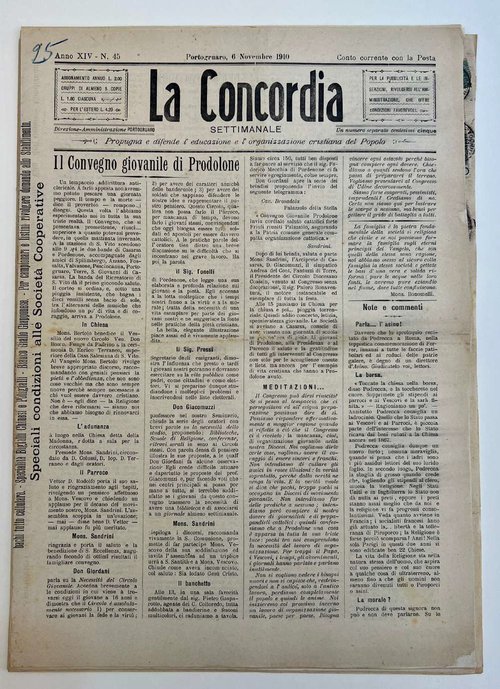 L'Archivio Storico Diocesano ha inteso provvedere al progetto di restauro del settimanale 'La Concordia', primo settimanale della Diocesi di Concordia Pordenone, pubblicato dal 1897 al 1917, anno in cui si interruppero le stampe a causa della disfatta di Caporetto. Il fondo, costituito da 72 fascicoli datati 1902-1916, presenti in due formati di mm 340x530 e di mm 420x300, si trovava in precario stato di conservazione e non poteva essere maneggiato o consultato a causa delle pieghe, delle ondulazioni e delle tensioni superficiali che in più parti avevano generato anche lacerazioni della carta. L'intervento di recupero ha completato il progetto di conservazione della testata denominata dal 1922 'Il Popolo', già avviato in collaborazione con l'Opera Odorico da Pordenone. L'intervento proposto dalla restauratrice Pedroni ha previsto: documentazione fotografica, pulizia meccanica a secco e microaspirazione, misurazione Ph della carta, spianamento dei manufatti previa vaporizzazione e pressatura, deacidificazione delle carte, velatura totale o parziale del verso della carta, risarcimento delle lacune con carta giapponese, integrazione cromatica a sotto tono con acquerello, inserimento dei quotidiani in camicia realizzata in carta barriera da archiviazione, redazione della relazione descrittiva.