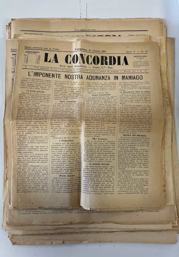 L'Archivio Storico Diocesano ha inteso provvedere al progetto di restauro del settimanale 'La Concordia', primo settimanale della Diocesi di Concordia Pordenone, pubblicato dal 1897 al 1917, anno in cui si interruppero le stampe a causa della disfatta di Caporetto. Il fondo, costituito da 72 fascicoli datati 1902-1916, presenti in due formati di mm 340x530 e di mm 420x300, si trovava in precario stato di conservazione e non poteva essere maneggiato o consultato a causa delle pieghe, delle ondulazioni e delle tensioni superficiali che in più parti avevano generato anche lacerazioni della carta. L'intervento di recupero ha completato il progetto di conservazione della testata denominata dal 1922 'Il Popolo', già avviato in collaborazione con l'Opera Odorico da Pordenone. L'intervento proposto dalla restauratrice Pedroni ha previsto: documentazione fotografica, pulizia meccanica a secco e microaspirazione, misurazione Ph della carta, spianamento dei manufatti previa vaporizzazione e pressatura, deacidificazione delle carte, velatura totale o parziale del verso della carta, risarcimento delle lacune con carta giapponese, integrazione cromatica a sotto tono con acquerello, inserimento dei quotidiani in camicia realizzata in carta barriera da archiviazione, redazione della relazione descrittiva.