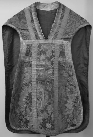 Restauro conservativo di una pianeta in lampasso di seta verde, completa di stola e manipolo