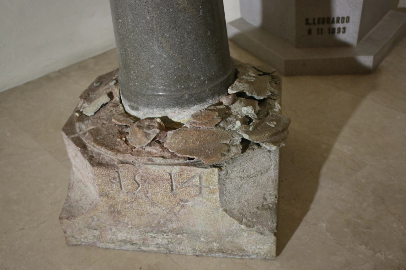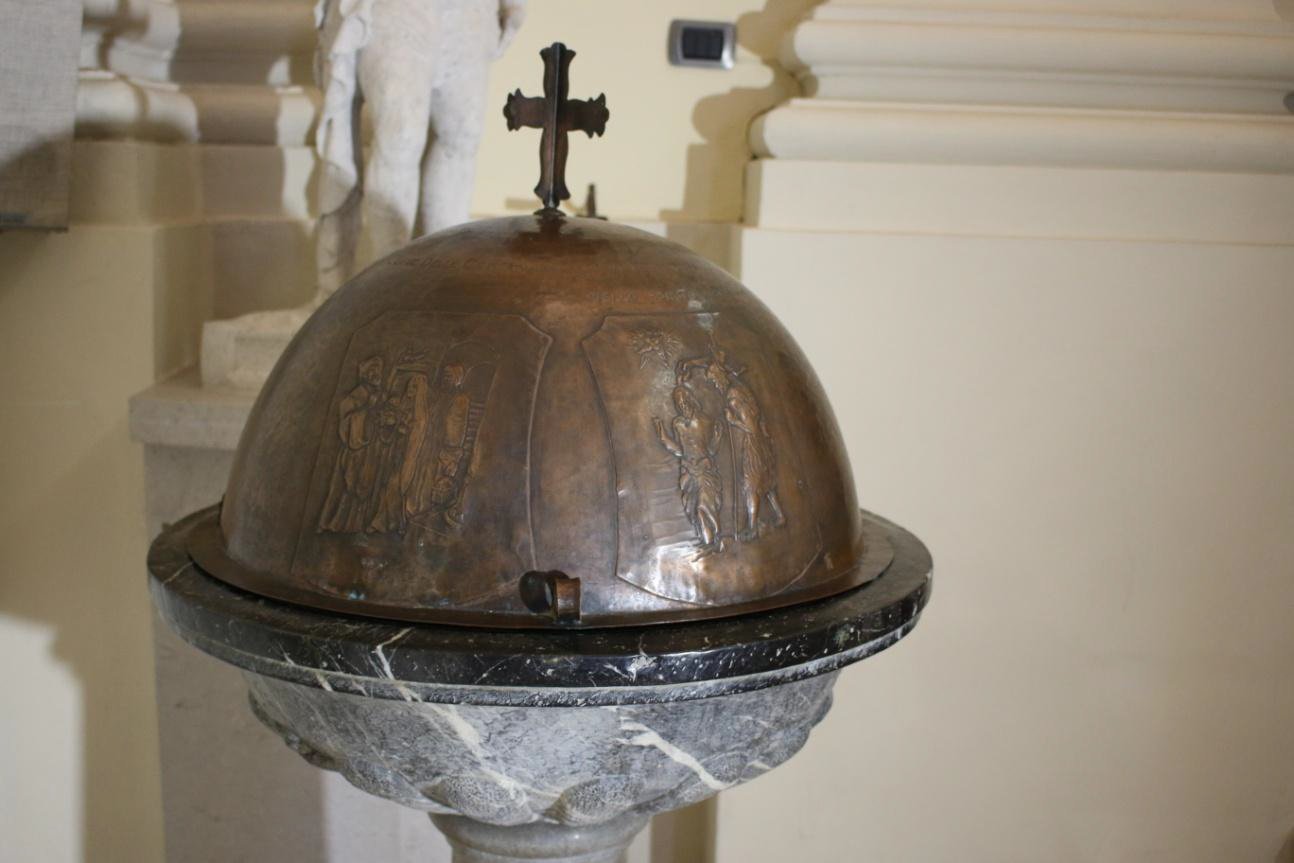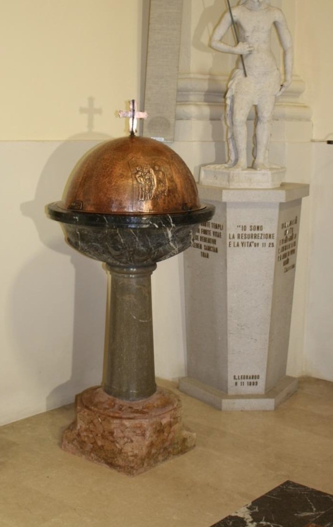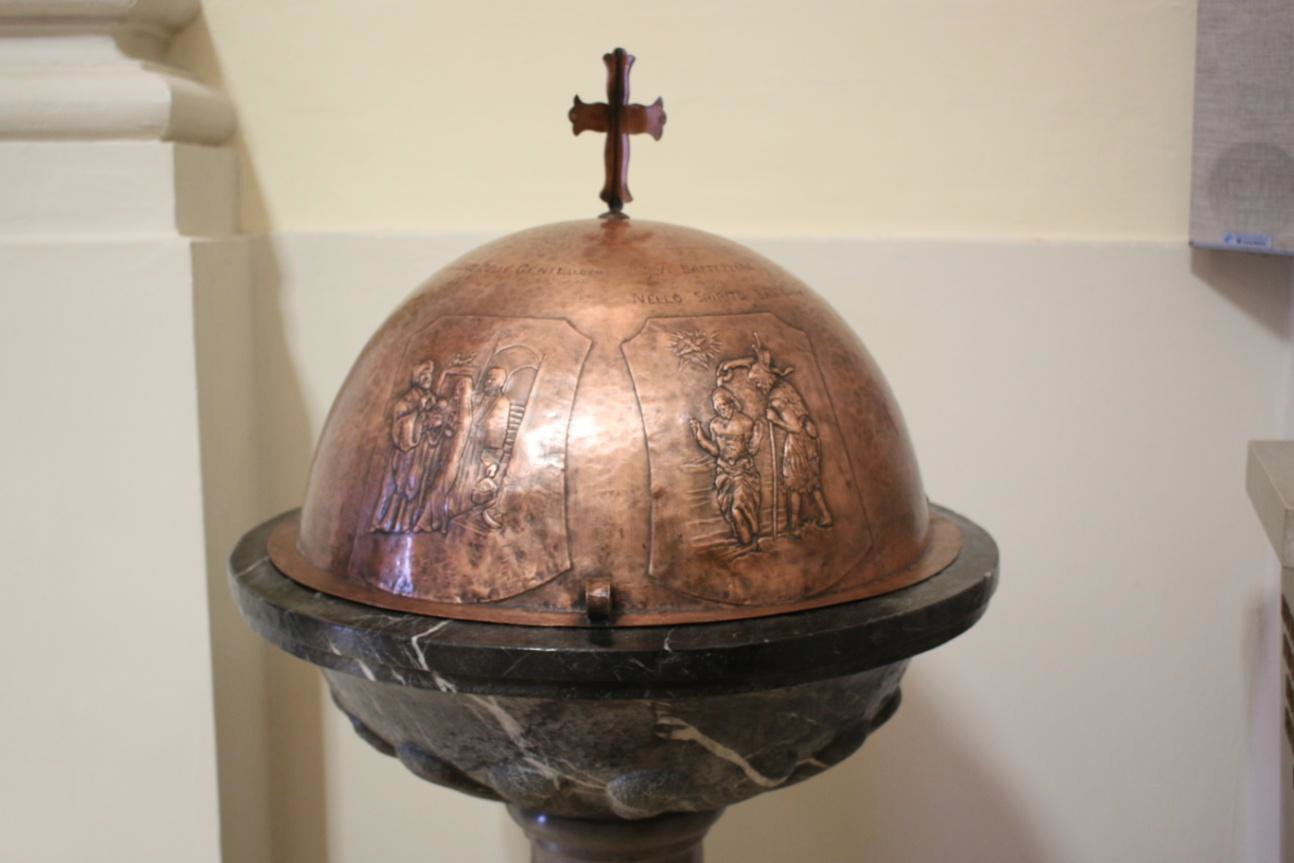 La Parrocchia ha avanzato la richiesta di restauro del fonte battesimale della Chiesa di Collalto di Tarcento. Il manufatto è formato da una vasca in pietra Nero di Timau sostenuta da un piedistallo composito, costituito da litotipi differenti derivanti dall'assemblaggio di pezzi non coevi: fusto di sezione circolare e collare in Piasentina, basamento quadrato con angoli superiori smussati in pietra calcarea Rosso Verzegnis, con incisa la data del 1514. Presumibilmente il basamento è l'unico elemento conservato di un analogo manufatto presente all'interno della chiesa primitiva risalente nel suo impianto al Duecento. La vasca è chiusa da una copertura in rame, apribile a metà, realizzata nel 1985. Il coperchio e il catino della struttura presentavano depositi incoerenti, particolato atmosferico e calcare sedimentato all'interno della vasca, al contrario fusto e basamento non risultavano stabili ed è stato necessario verificare la condizione dei perni metallici di collegamento tra le parti, inoltre, il basamento si presentava fratturato con scaglie di pietra del tutto distaccate, comportando un indebolimento strutturale. L'intervento di restauro proposto dalla restauratrice Olivieri ha previsto la pulitura del particellato e l'eliminazione delle incrostazioni calcaree, il fissaggio degli elementi mobili con imperniature in acciaio inox, l'incollaggio dei frammenti del basamento, la stuccatura delle parti discontinue per la perdita dei frammenti, la stesura del protettivo finale a cera microcristallina. Infine, per il coperchio è stata eseguita la rimozione dell'eccesso di ossidazione e degli accumuli nelle pieghe delle figure e la stesura di vernici protettive finali.