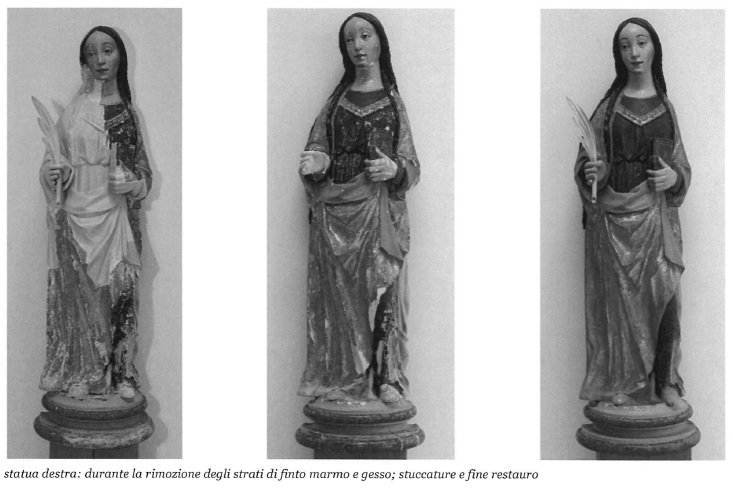 La Parrocchia ha provveduto all'intervento di recupero delle due sculture lignee policrome raffiguranti Sante Vergini Martiri dell'inizio del XVI secolo, probabile resto di un trittico, come suggerito da Paolo Goi e Giuseppe Bergamini nel volume dedicato al Duomo di Maniago. Entrambe le opere, raffigurate con in mano un libro e la palma del martirio, ma senza attributi specifici necessari a individuarne il nome, poggiano su un basamento circolare e si presentano ridipinte a finto marmo con interventi documentati dovuti a Osvaldo di Rosa detto Trailo (1710) e a Giacomo Marizza di Poffabro (1875). Le opere presentavano una situazione di degrado dovuta ad attacco di insetti xilofagi evidente sul retro, ma presente anche sulle parti pittoriche, presenza di cinque strati di pesanti ridipinture e distacchi degli strati policromi. L'intervento di restauro proposto dalla restauratrice Comoretto ha previsto: lo smontaggio delle opere e il ricovero in laboratorio, la disinfestazione da insetti xilofagi, il fissaggio delle policromie e la successiva stiratura, la rimozione di tutti gli strati marmorizzati e dei residui di stucco e colla organica, la stuccatura delle lacune, l'integrazione pittorica ad acquerello con rigatino finalizzata a conferire unità d'immagine all'opera, la verniciatura finale e la lucidatura delle dorature, la documentazione fotografica e la relazione finale.