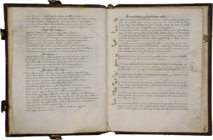 - Legatura a due capi ritorti con nervi di rinforzo sul costolo; coperta in legno rivestito in cuoio decorato con motivi geometrici